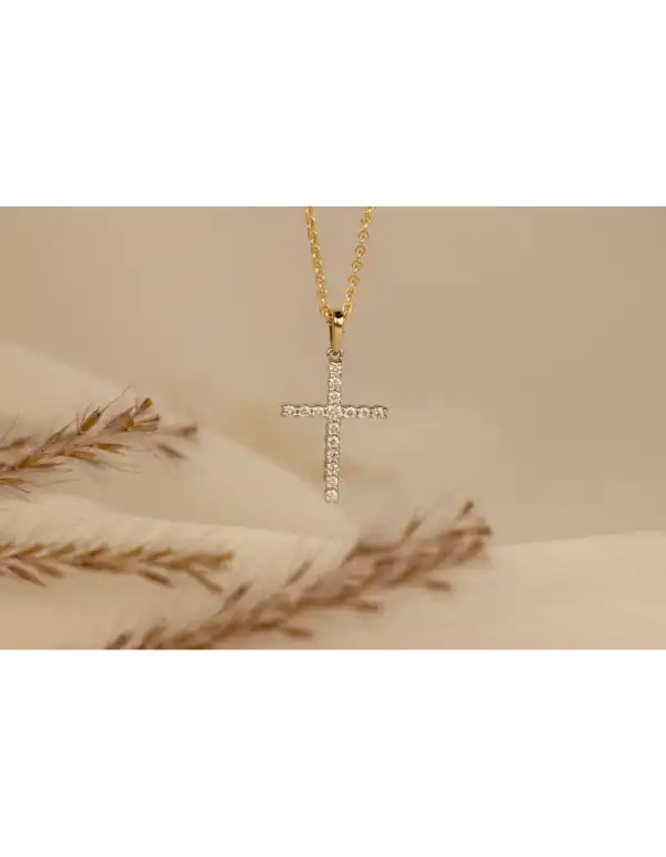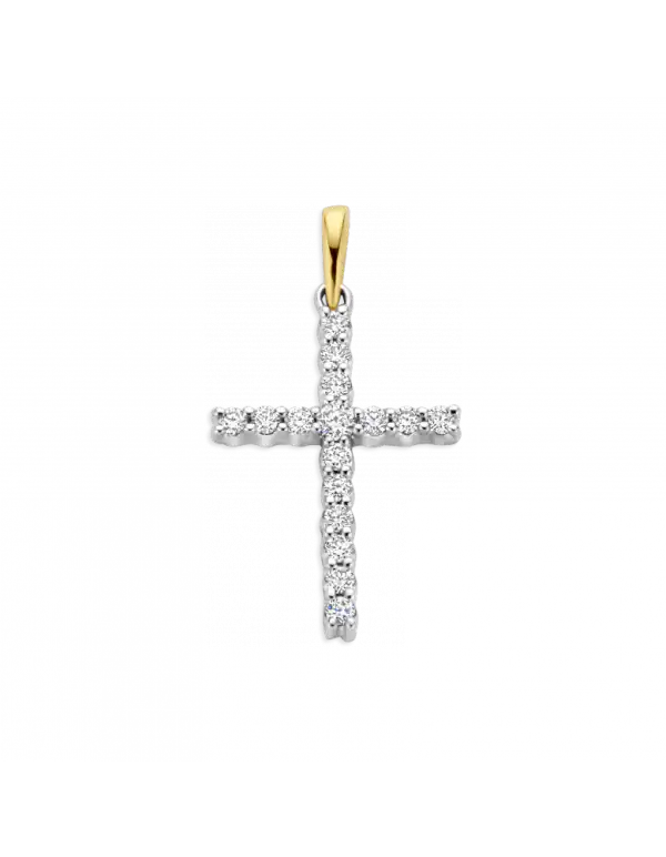 BARI is een wit gouden hanger in de vorm van een kruis met geel gouden hanger oog. Briljant hanger BARI heeft 0.15 crt. briljant geslepen diamant in de kwaliteit H/Si.