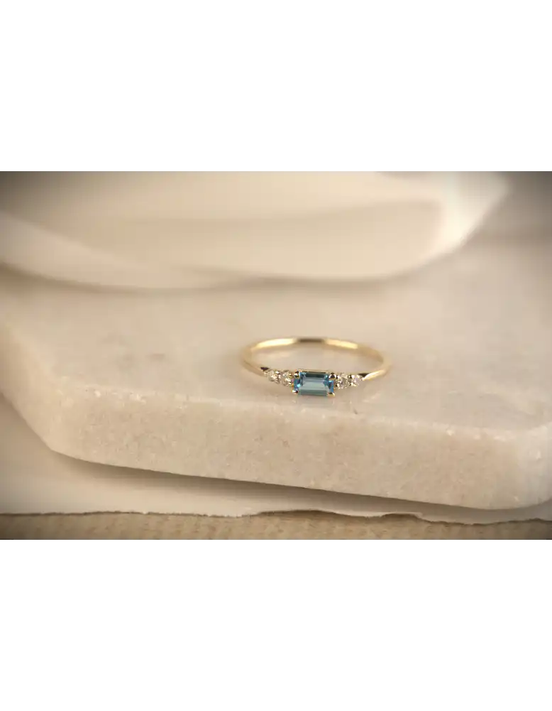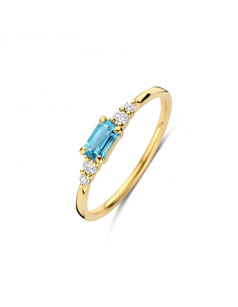 CASA is een verfijnde geel gouden ring met 0.10 crt. H/Si briljant geslepen diamanten en een prachtige rechthoekige Swiss Blue Topaz.