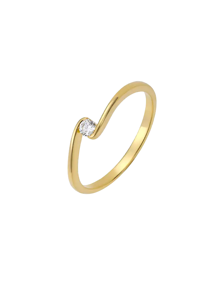 Ring NERA met een briljant geslepen diamant van 0.07 crt. H/Si, is uitgevoerd in 14 karaats geel goud. Elegant en modern door het slag model. Schitterend in combinatie met oorsieraden en hanger.