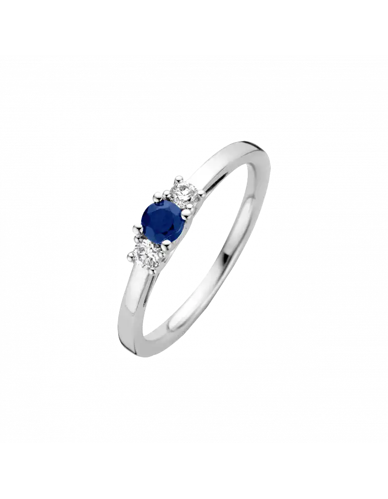 Wit gouden Briljant ring NOZZA bevat 2 briljanten die samen 0.13 crt. wegen en H/Si kwaliteit hebben. Samen met de 0.22 crt. blauwe saffier geeft dit NOZZA koninklijke allure